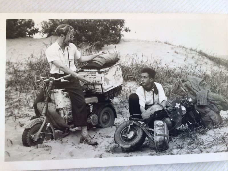 Sahara D's I had this fantastic sent to me by Carlos from the Lambretta Club of South Africa, (thanks Carlos!) It’s of a couple of French guys (although I think they actually may be from the french speaking part of Switzerland, from the writing on  the ‘topbox’ flag on the laid down Lammie)… on route from Lausanne to “le Cap”. The pic was taken in the Sahara! That’s quite a trip! Carlos reckons it was sometime in the ’50’s. I love their style… baggy trousers, a pair of stout brogues, beatnik beards and a nice tweed sports jacket for when it gets a bit chilly. They bred ’em tough in them days.