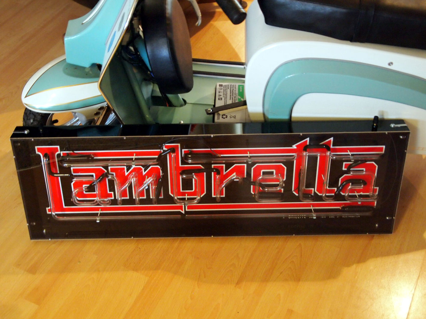 NeonSign-2-18-8-2014I discovered some great Lambretta signage over on ebay, all of which would look wonderful on the wall of your garage, workshop, or even living room, depending on how accommodating your other half is to your Lambretta obsession. Cream of the crop, (I should really save this to last, but I don’t want you to miss it) is this beautiful neon sign… who wouldn’t wan this beauty? If you’ve seen the one at the Lambretta Museum in Weston, this is double of it. Here it is on eBayNeonSign-1-18-8-2014