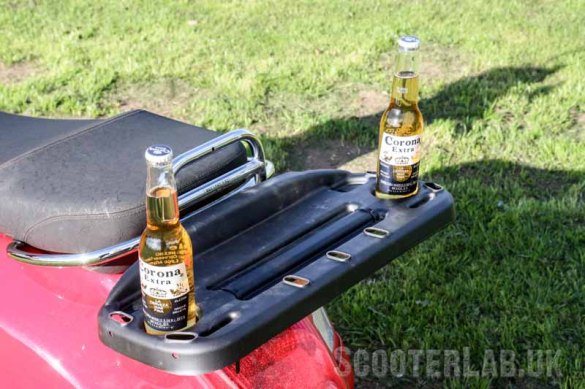“The SLUK Support is exclusive to SLUK What is it? It’s lightweight, yet extremely strong and has been made specifically to fit the genuine Vespa GTS rear carrier (will also fit other racks/scooters). A separate version is available for Lambretta & Scomadi. It adds support for your load, keeping your otherwise droopy bags away from the indicators/exhaust etc. The ribbed sections of the Support fit directly over the bars of the genuine rear carrier and it’s secured using the re-useable extra strong tie wraps provided.”