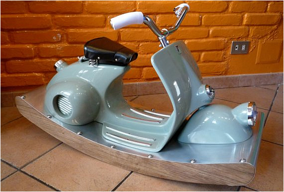 How cool of a gift is this for your kid, an Italian scooter rocking chair! This rocking-Vespa is made of fiberglass with aluminum and steel details, it also has working lights and horn.