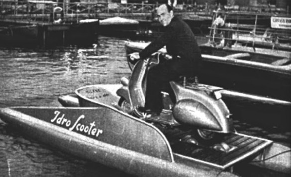 In 1952, French motorcycle racing champion Georges Monneret leaving Paris, France for for Calais, where he was met with a crew who installed a pair of custom pontoons to scooter. It was an amphibious craft powered by a 1952 125cc Vespa Douglas. From there, Monneret went about crossing the famed English Channel aboard the waterborne scooter.