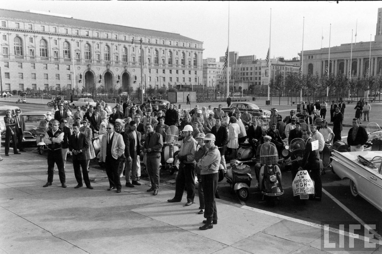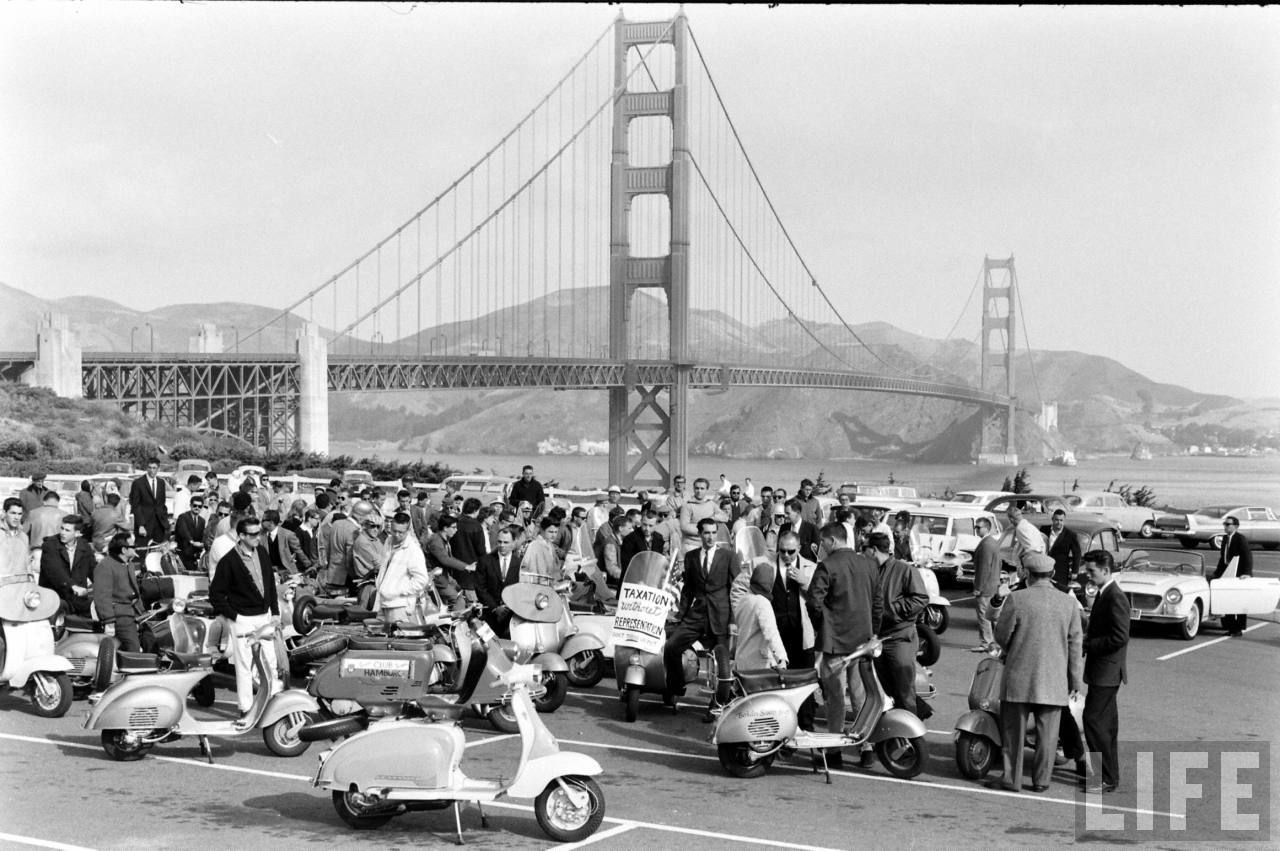 I don’t know exactly what’s doing on here… but there are some clues. Firstly the location is clearly San Fransisco… and specifically the Golden Gate Bridge. I wonder if any of my US readers remember the Berkley Scooter Shop? On the front of one the TV’s there’s a badge for “Al (Second name unreadable)* San Francisco” is also the pic of Warren Carver… who, his badge is “Road Captain” of the Pioneer Scooter Club, SF. Though I reckon he really wanted to be in the California Highway Patrol…